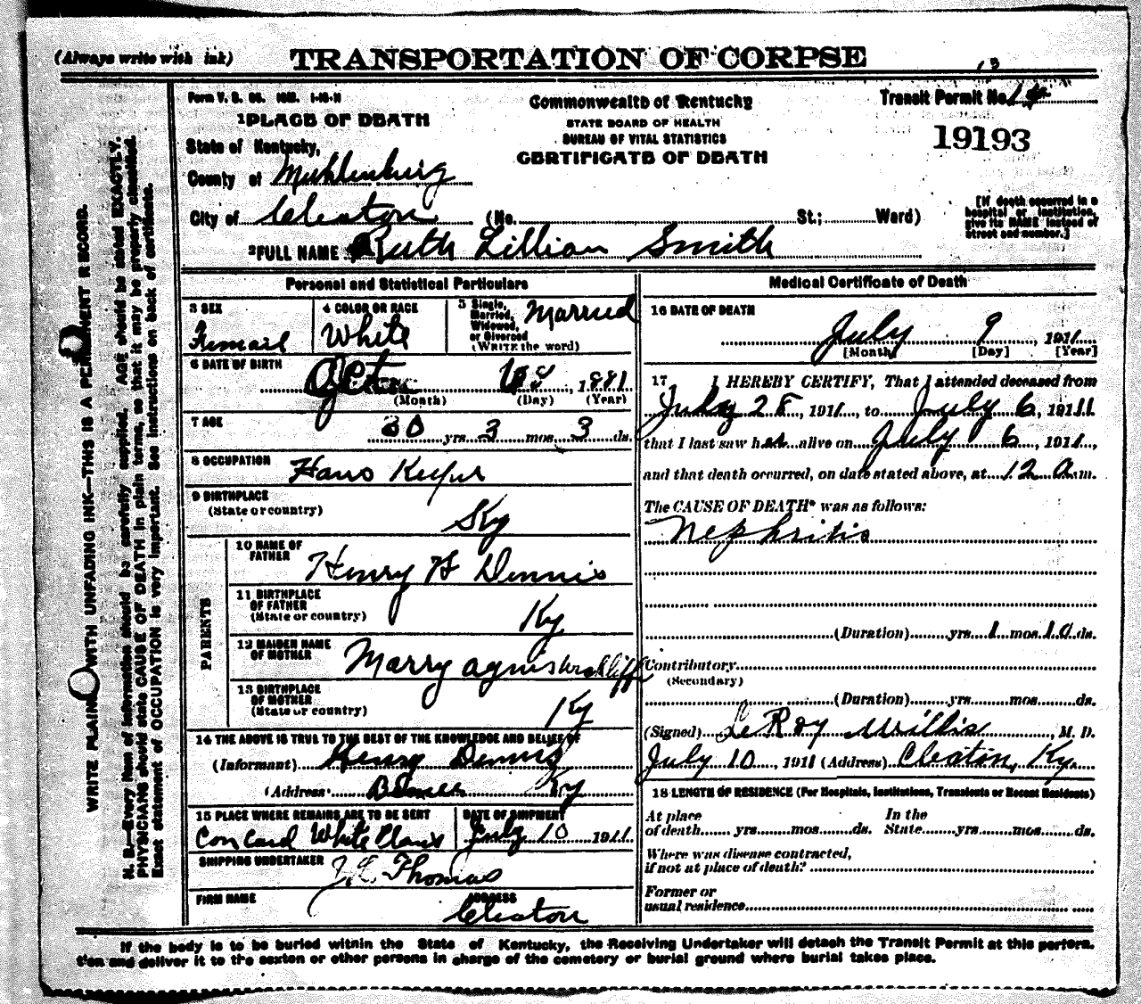 - Smith, Ruth Lillian (1881 - 1911) Kentucky Death Certificate 19193.