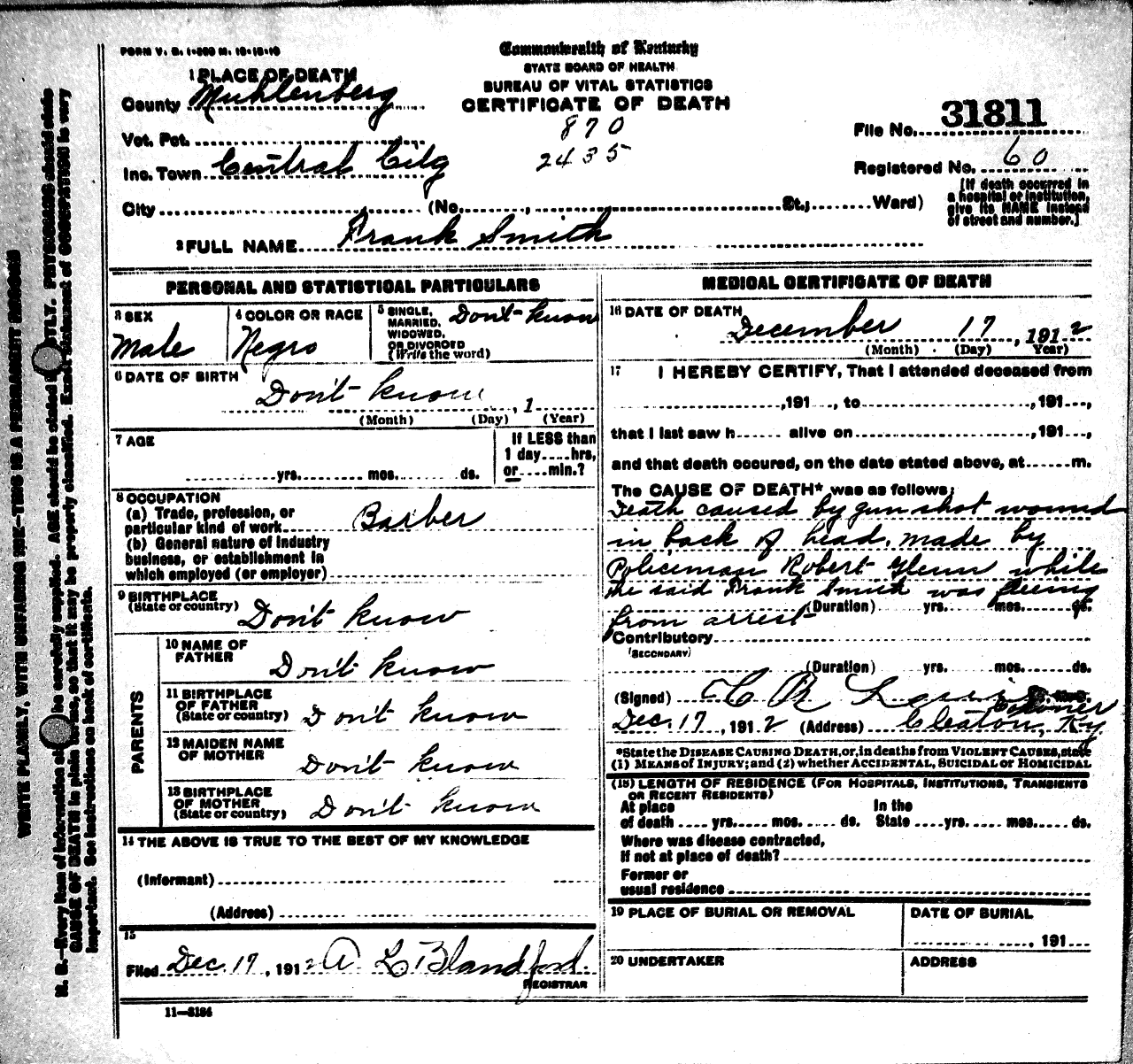 - Smith, Frank ( - 1912) Kentucky Death Certificate 31811.