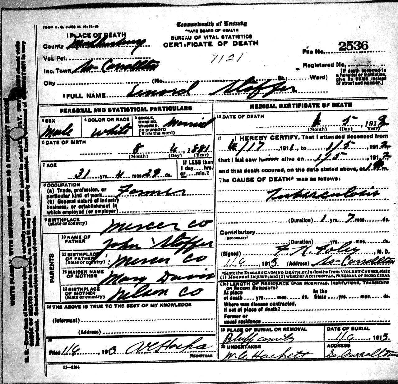 - Stoffer, Lenord (1881 - 1913) Kentucky Death Certificate 2536.