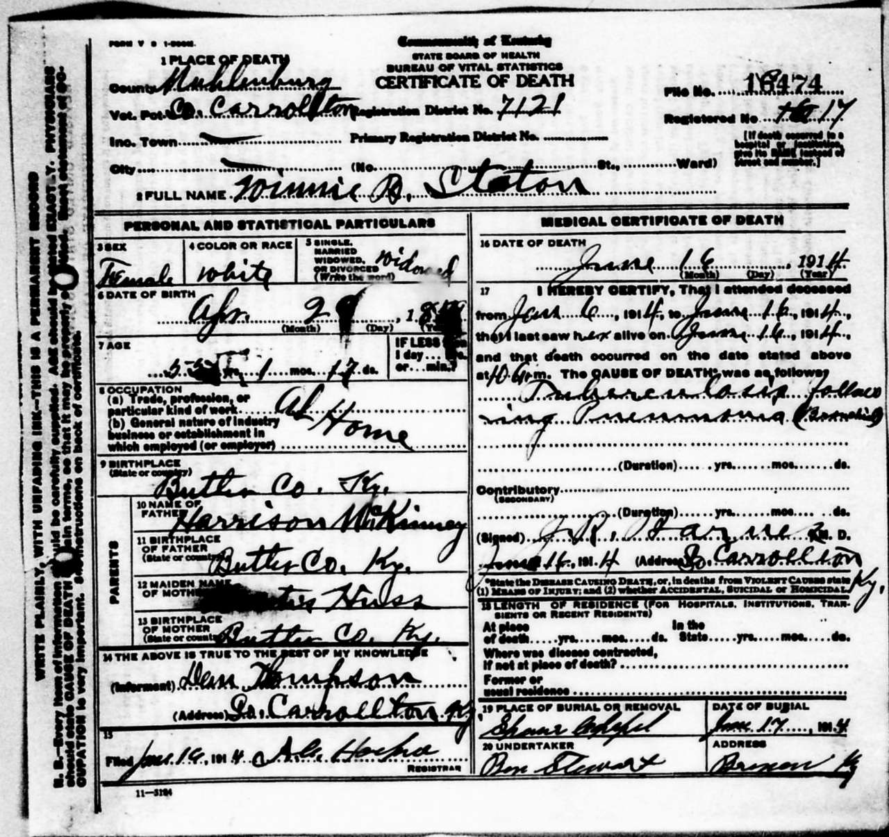 - Staton, Winnie B. (1859 - 1914) Kentucky Death Certificate 16474.