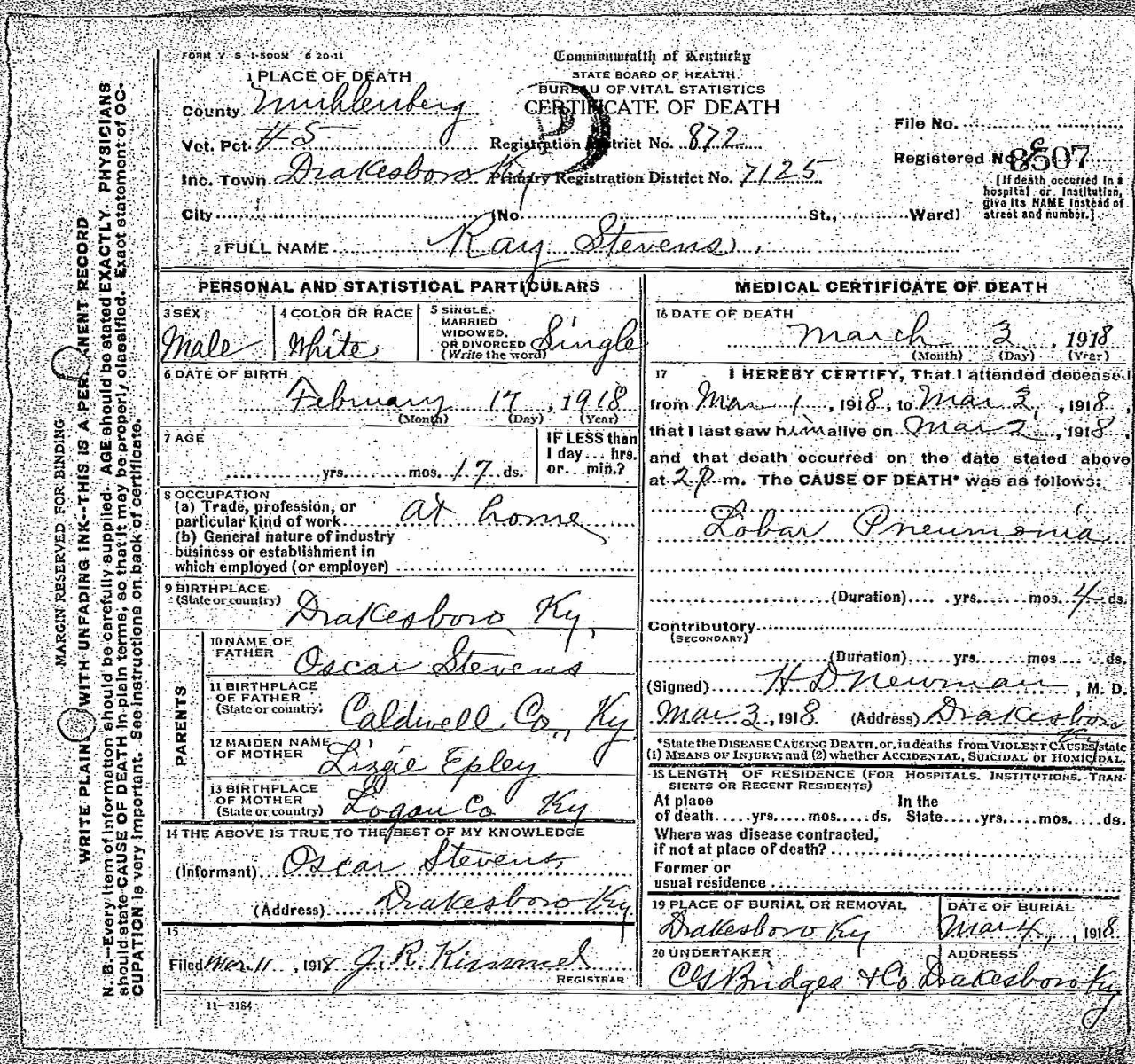 - Stevens, Robert William (1917 - 1919) Kentucky Death Certificate 16968.