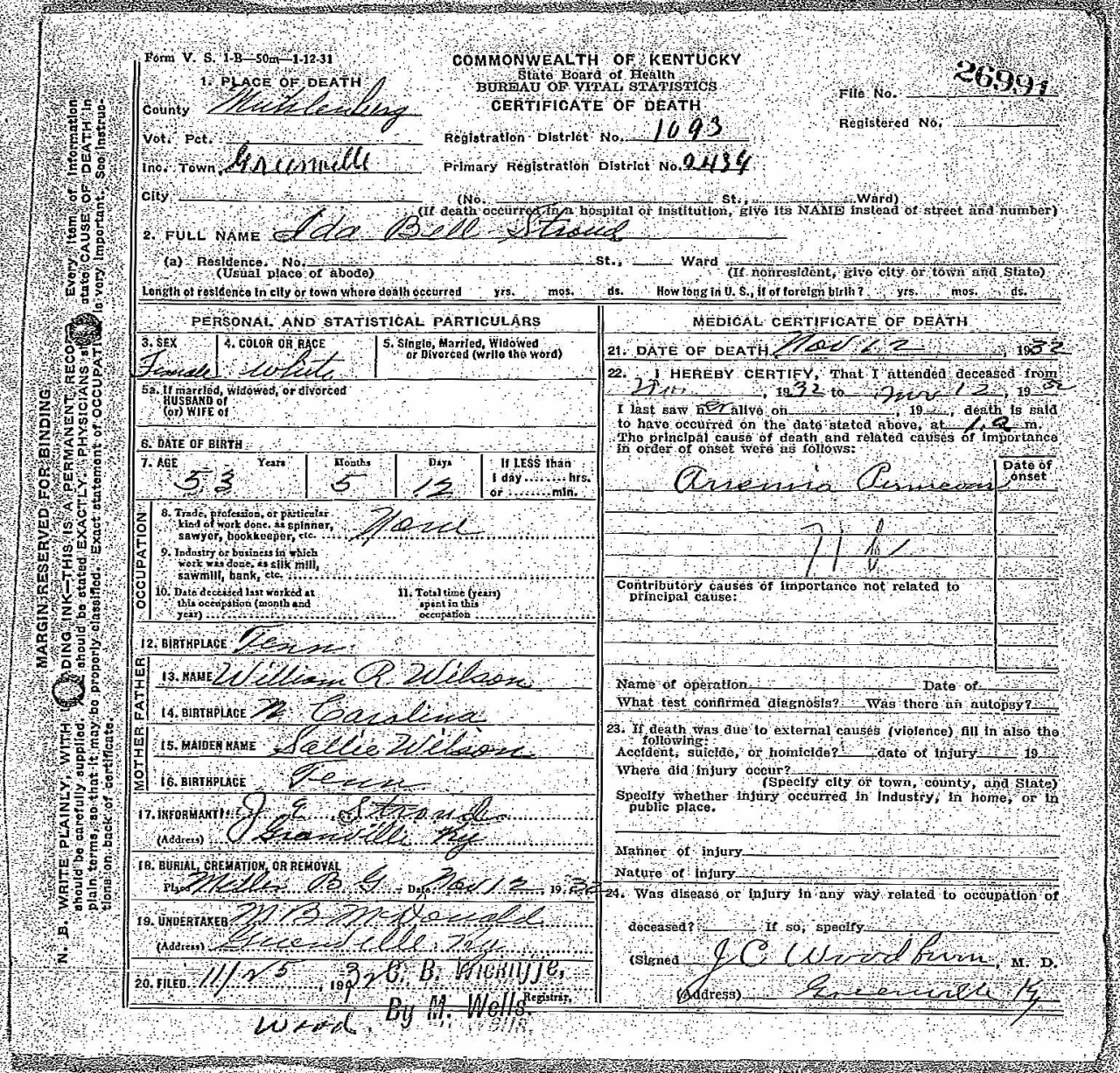 - Stroud, Ida Bell (1879 - 1932) Kentucky Death Certificate 26991.