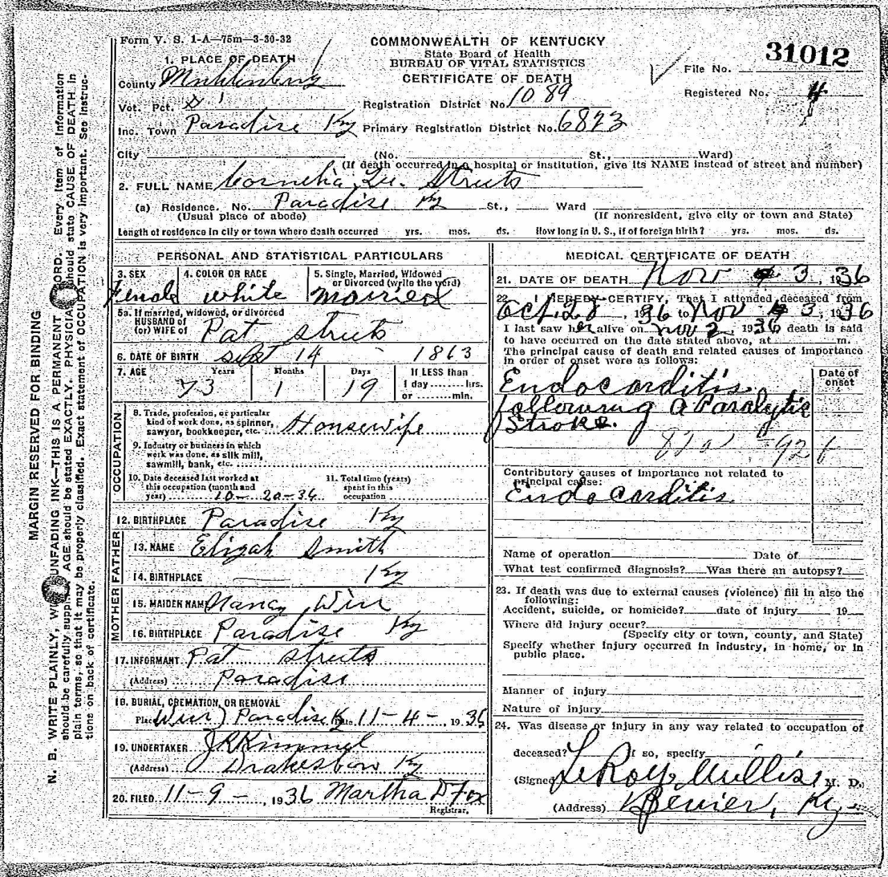 - Stirsman, Nancy E. (1867 - 1931) Kentucky Death Certificate 30686.