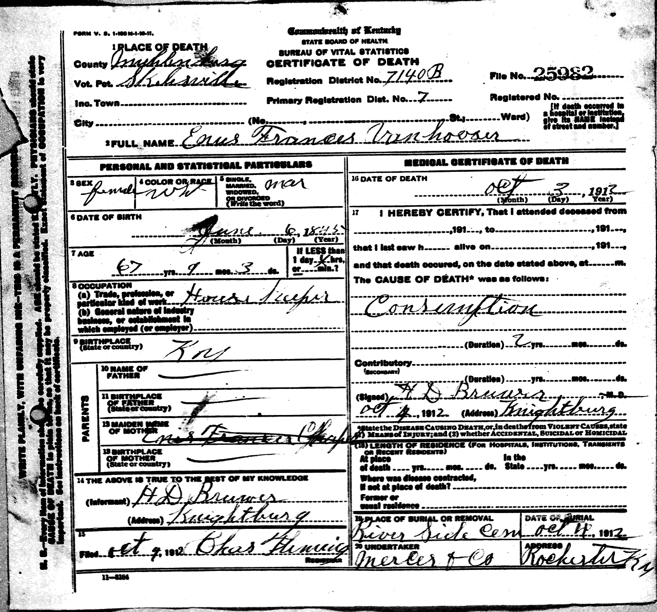 - Vanhooser, Enus Frances (1845 - 1912) Kentucky Death Certificate 25982.