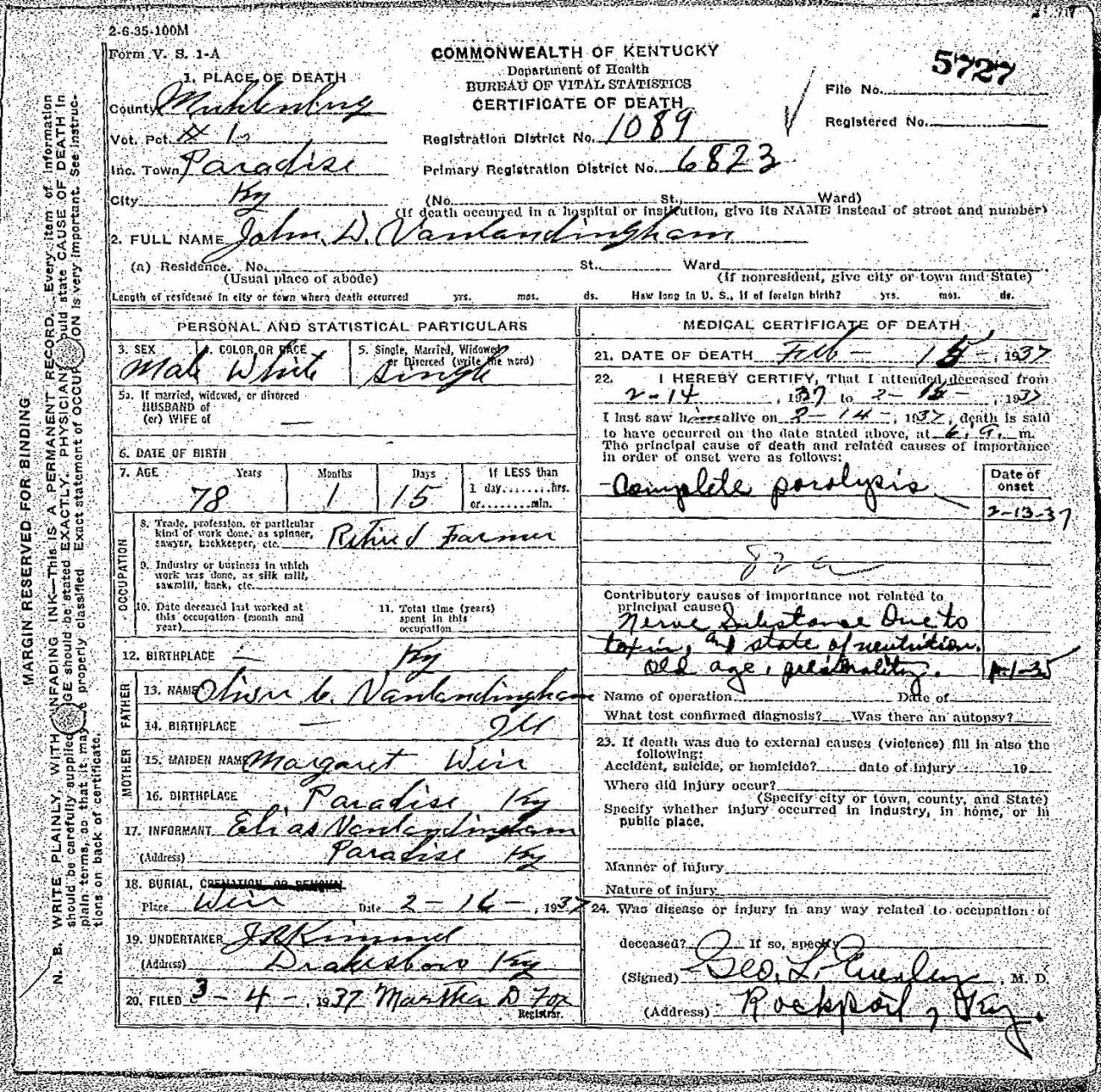 - Vanlandingham, John D. (1859 - 1937) Kentucky Death Certificate 5727.