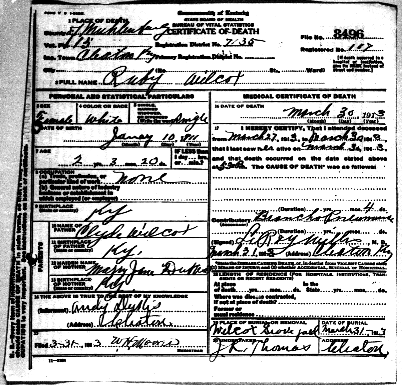 - Wilcox, Ruby (1911 - 1913) Kentucky Death Certificate 8496.