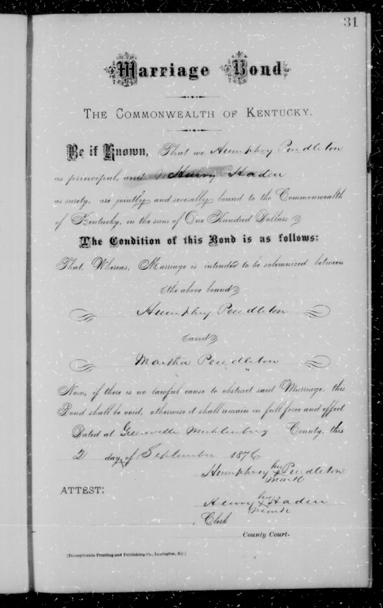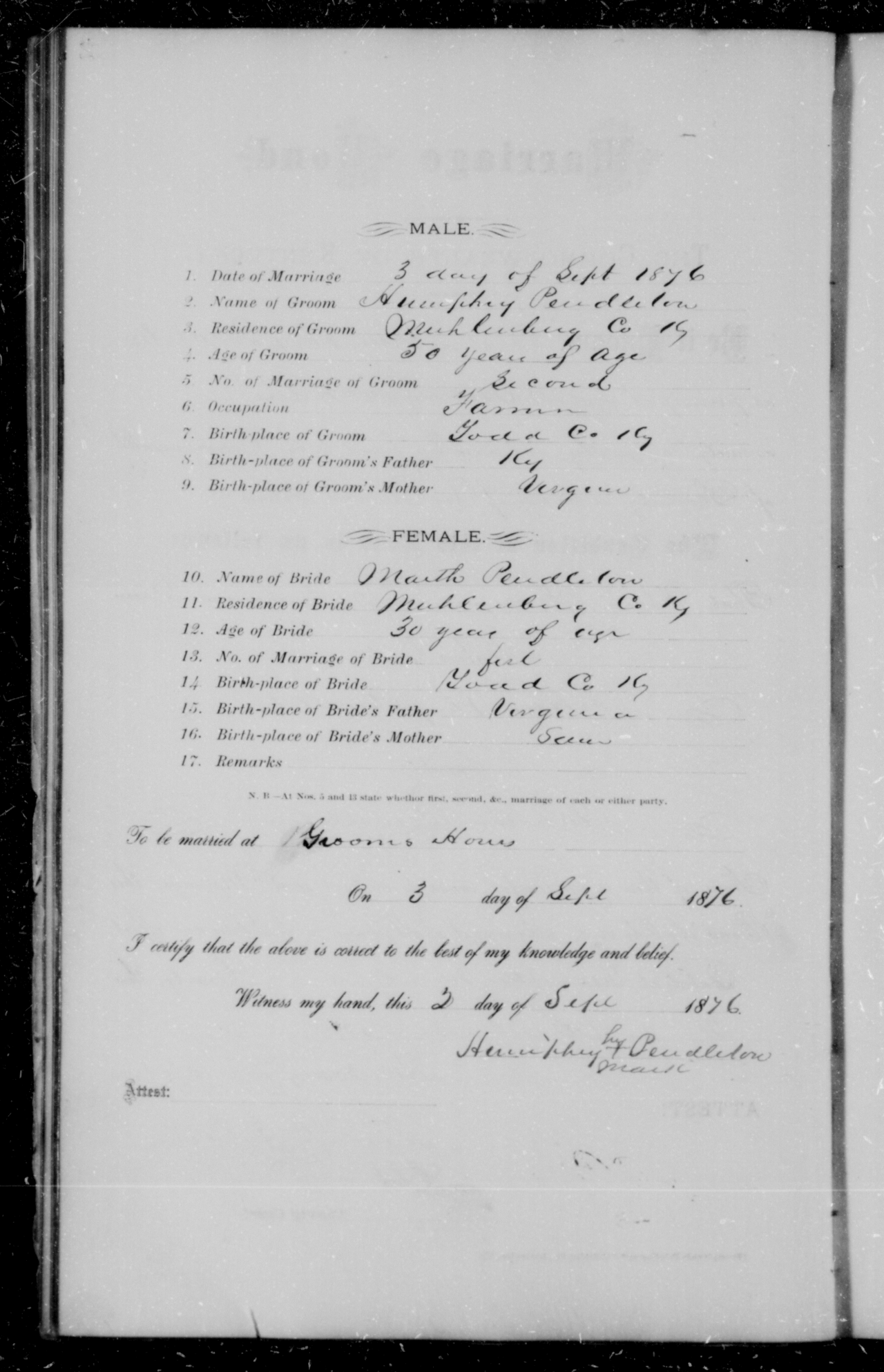 | 1876 | Pendleton, Martha | Pendleton, Humphrey | 3:31 | Page 31a Page 31b |