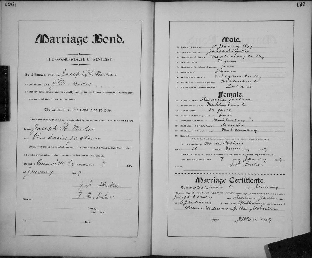 | 1897 | Jackson, Theodocia | Dukes, Joseph A. | 21/196 | p.196 |