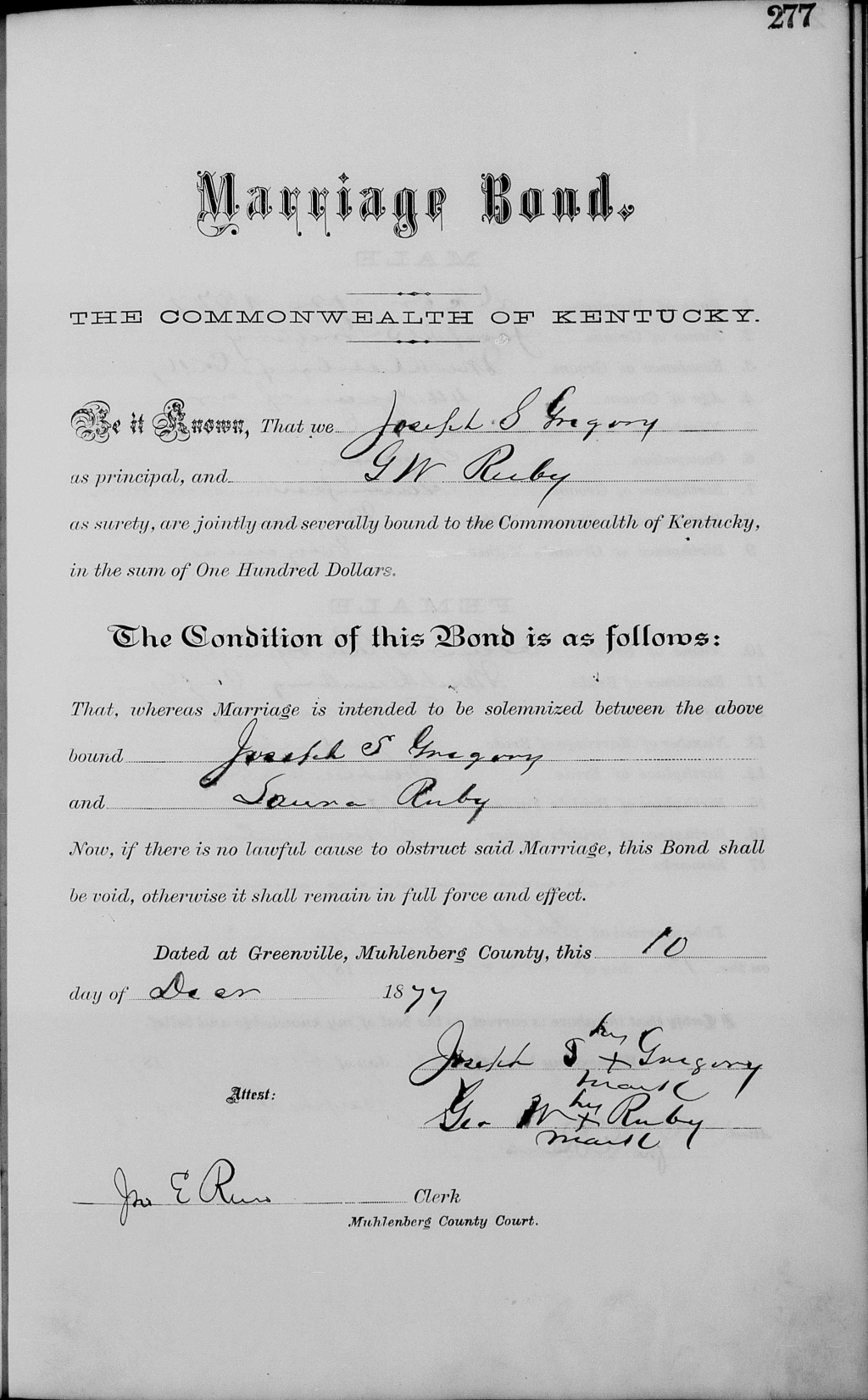 | 1877 | Ruby, Laura | Gregory, Joseph S. | 11/277 | Page 277 |
