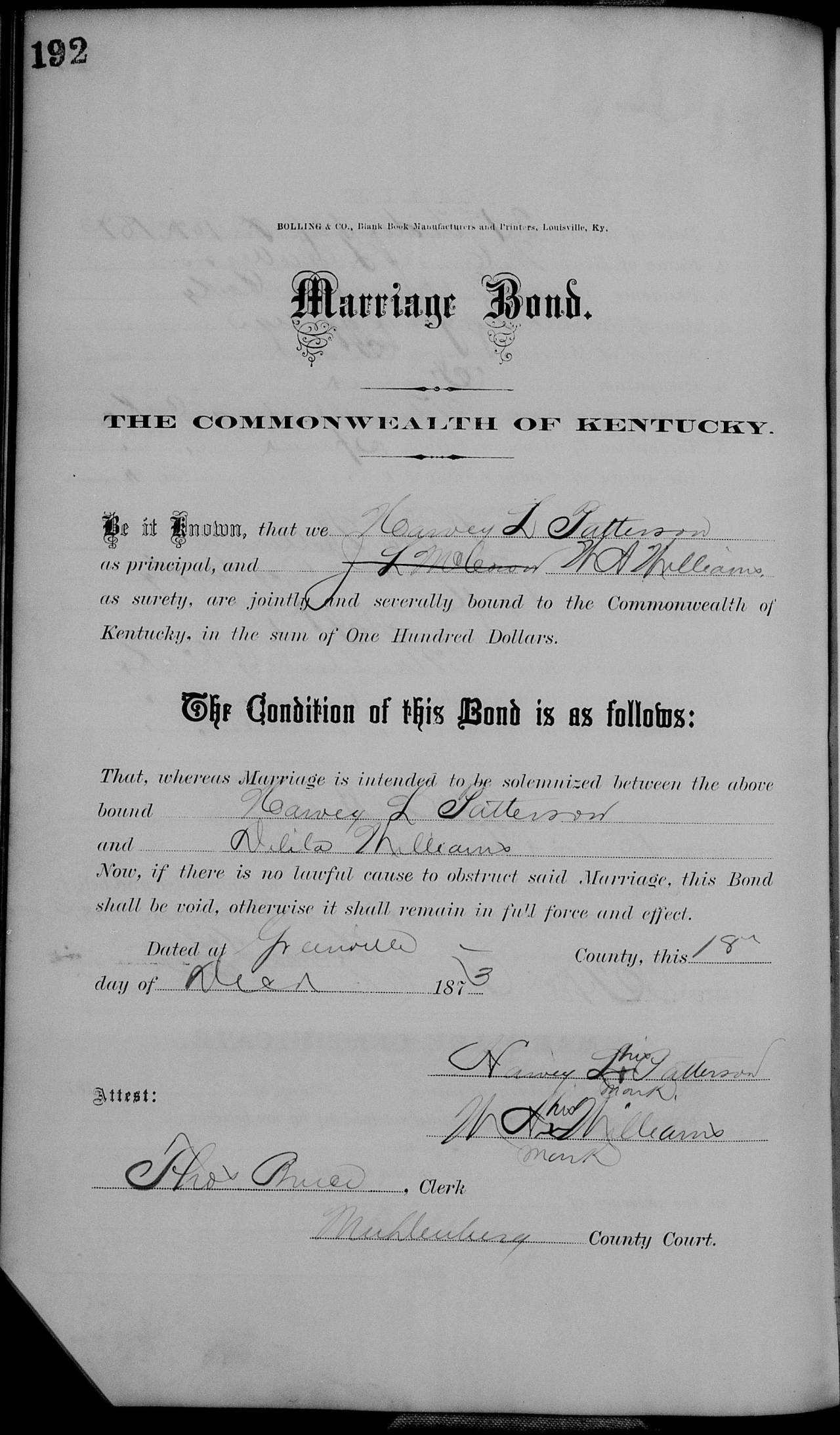 | 1873 | Williams, Delila | Patterson, Harvey L. | 9/191 | p.191 p.192 |