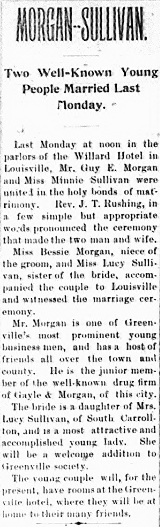 - Morgan, Guy E. & Minnie Sullivan. Greenville Banner [KY], 30 Mar 1899, Article.