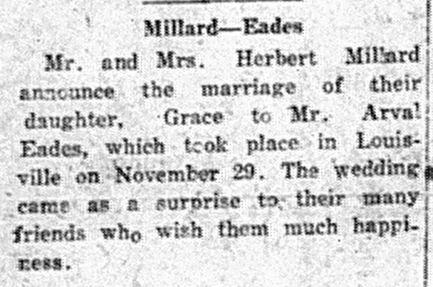 - Millard, Grace & Arval Eades. Central City Argus [KY], 29 Jan 1926, Article.