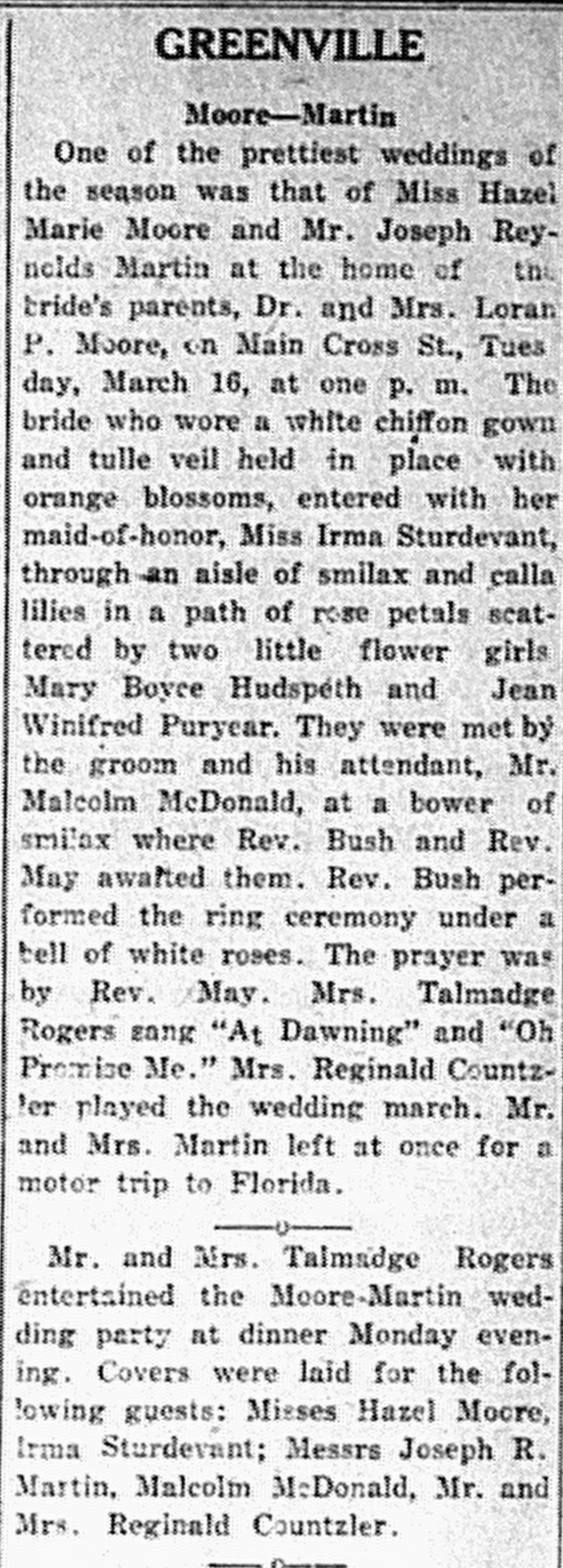 - Moore, Hazel Marie & Joseph Reynolds Martin. Central City Argus [KY], 19 Mar 1926, Article.