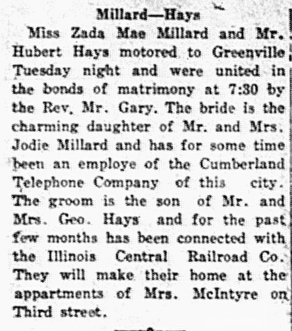 - Millard, Zada Mae & Hubert Hays. Central City Argus [KY], 7 Jan 1927, Article.