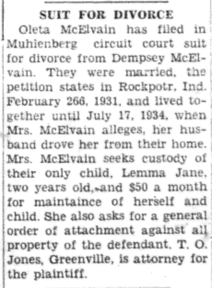 - McElvain, Oleta vs. Dempsey McElvain. Greenville Leader [KY], 17 Aug 1934, Article.
