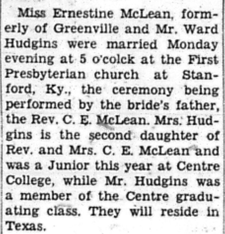 - McLean, Ernestine & Ward Hudgins. Greenville Leader [KY], 15 June 1934, Article.