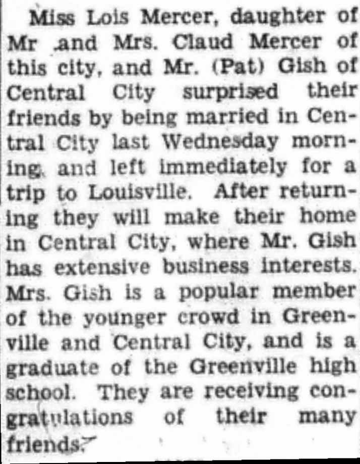 - Mercer, Lois & Pat Gish. Greenville Leader [KY], 21 Sept 1934, Article.