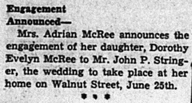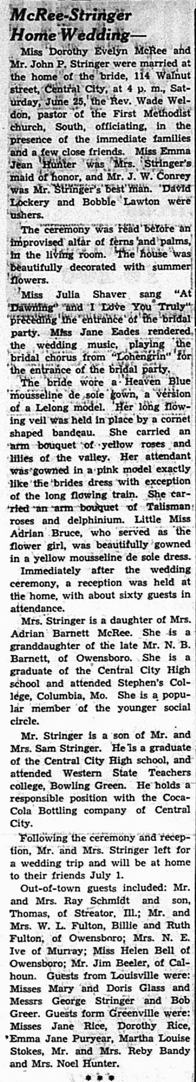 - McRee, Dorothy Evelyn & John P. Stringer. Times Argus [Central City, KY], 27 May 1938, Article.