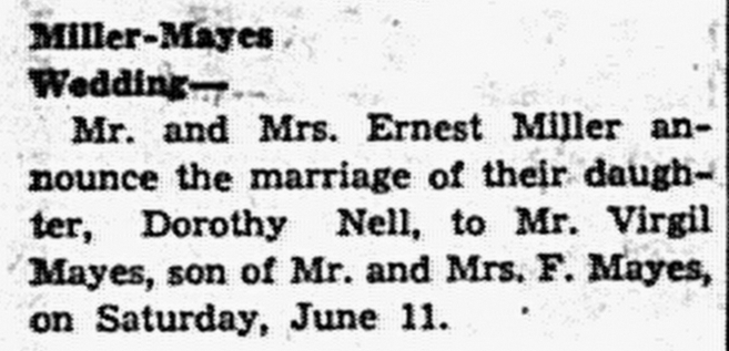 - Miller, Dorothy Nell & Virgil Mayes. Times Argus [Central City, KY], 24 June 1938, Article.