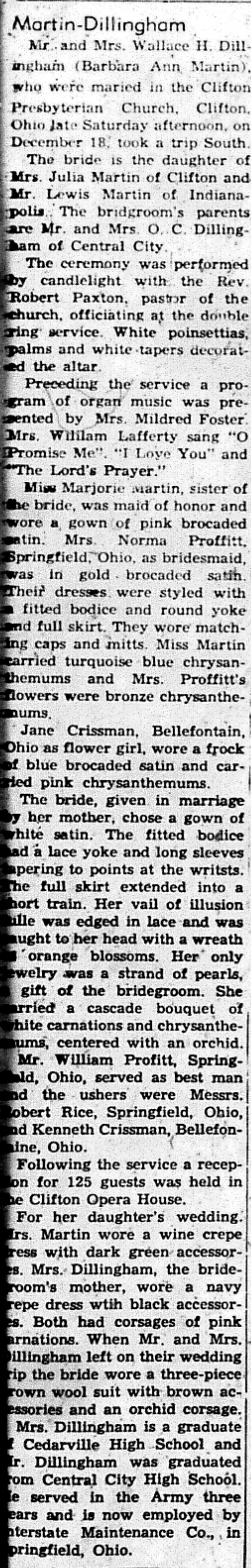 - Martin, Barbara Ann & Wallace H. Dillingham. Messenger [Central City, KY], 13 Jan 1949, Article.