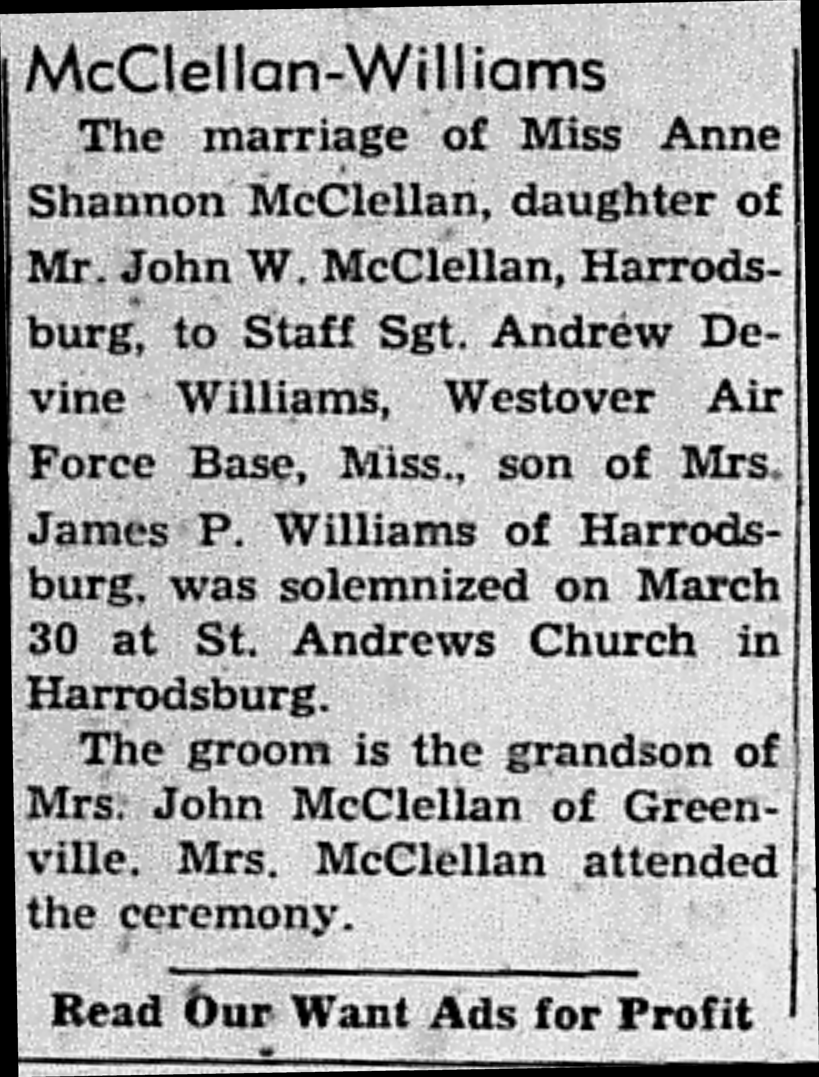 - McClellan, Anne Shannon & Andrew Devine Williams. Messenger [Central City, KY], 14 Apr 1949, Article.