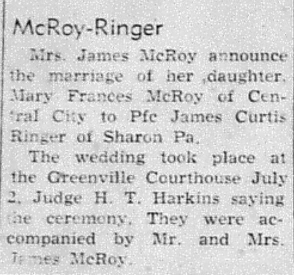 - McRoy, Mary Frances & James Curtis Ringer. Messenger [Central City, KY], 21 July 1949, Article.