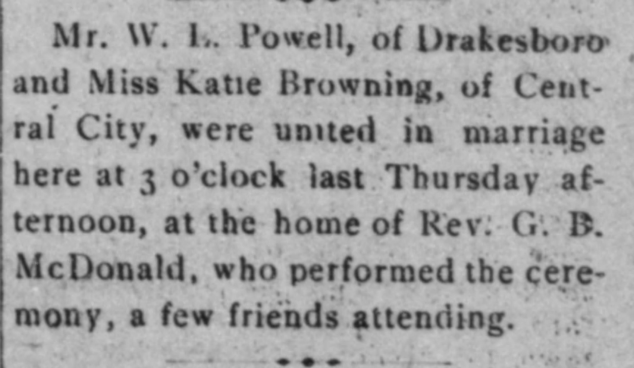 - Powell, W.L. & Katie Browning. Record [Greenville, KY], 15 Apr 1909, Article.
