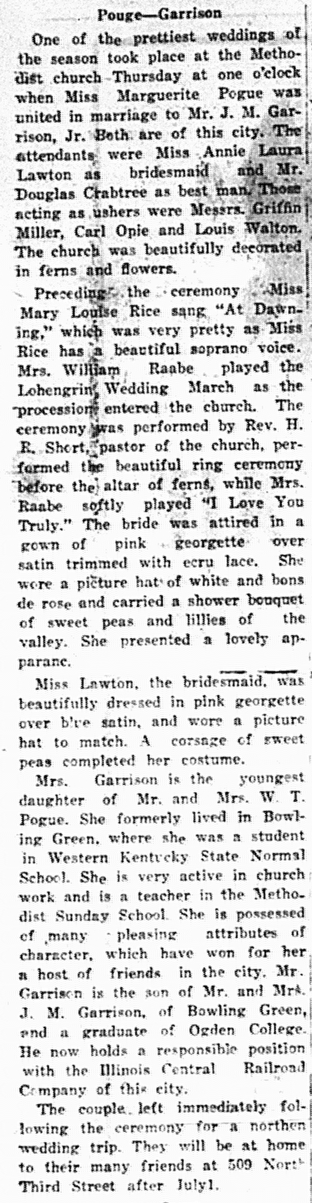 - Pouge, Marguerite & J.M. Garrison Jr. Central City Argus [KY], 2 July 1926, Article.