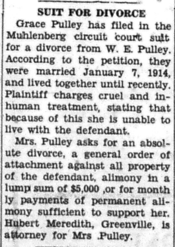 - Pulley, Grace vs. W.E. Pulley Greenville Leader [KY], 6 Apr 1934, Article.
