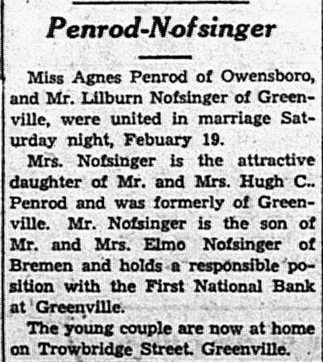 - Penrod, Agnes & Lilburn Nofsinger. Times Argus [Central City, KY], 4 Mar 1938, Article.