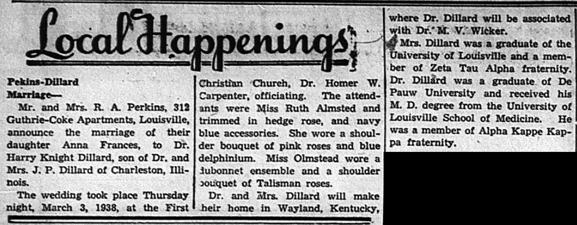 - Perkins, Anna Frances & Harry Knight Dillard. Times Argus [Central City, KY], 11 Mar 1938, Article.