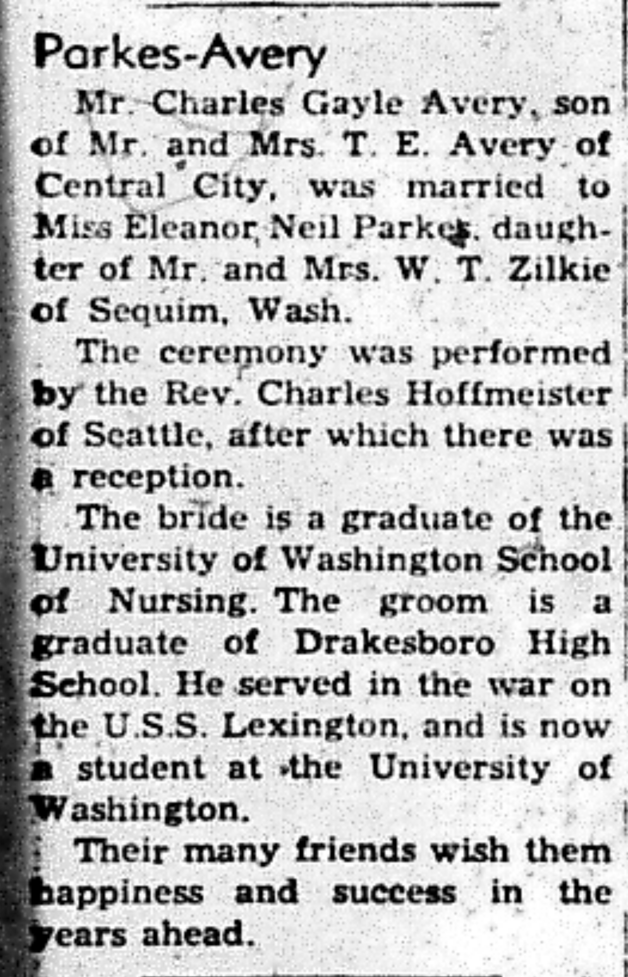 - Parkes, Eleanor Neil & Charles Gayle Avery. Messenger [Central City, KY], 6 Jan 1949, Article.