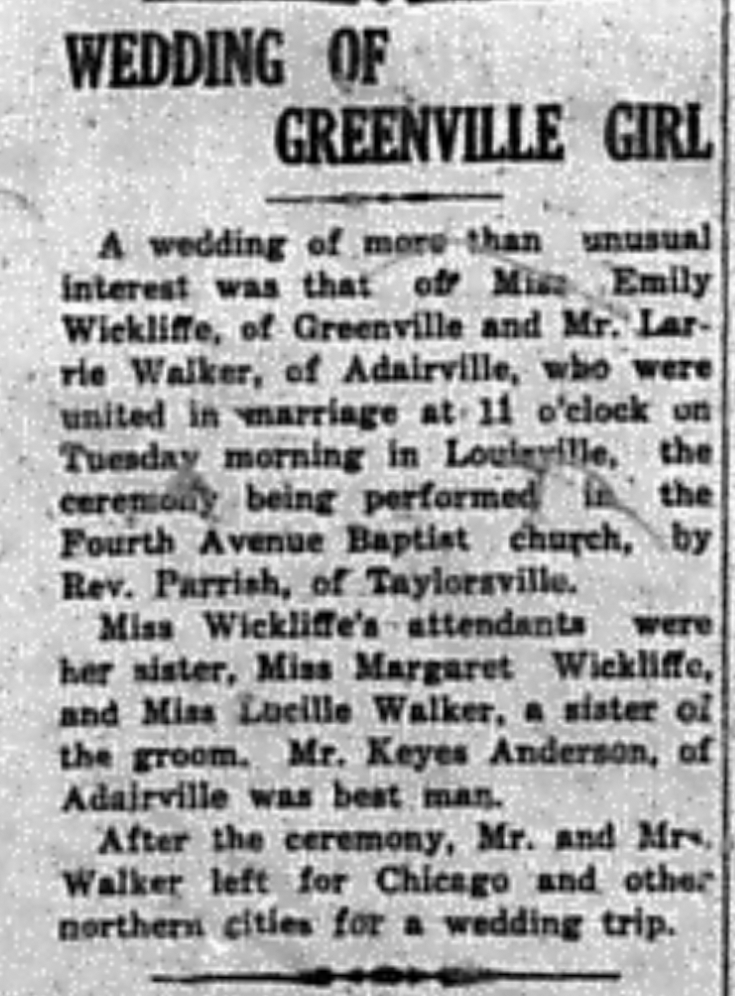 - Wickliffe, Emma & Larrie Walker. Central City Times [KY], 12 Nov 1925, Article.