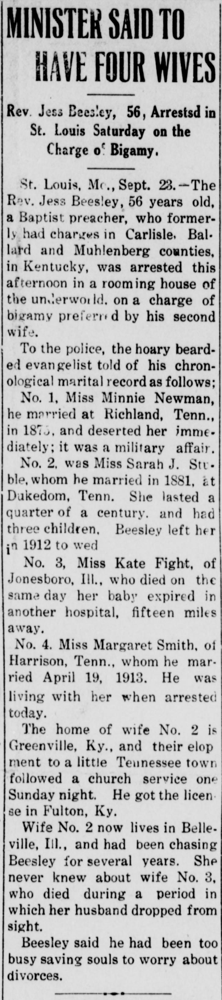 - Minister said to have four wives. Crittenden Record Press [Marion, KY], 25 Sept 1913, Article.