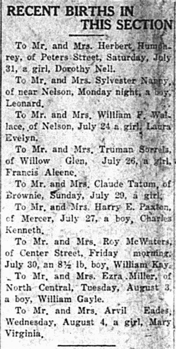 - Recent births in this section. Central City Argus [KY], 6 Aug 1926, Article.
