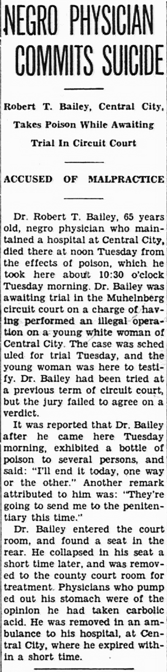 - Negro physician commits suicide. Greenville Leader [KY], 20 Apr 1934, Article.