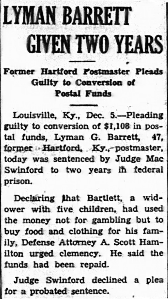 - Lyman Barrett given two years. Times Argus [Central City, KY], 9 Dec 1938, Article.