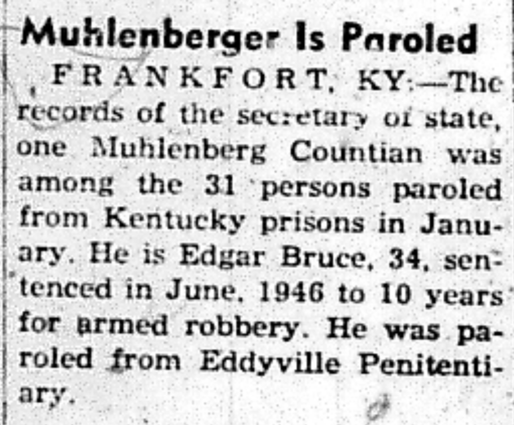 - Muhlenberger is paroled. Messenger [Central City, KY], 17 Feb 1949, Article.
