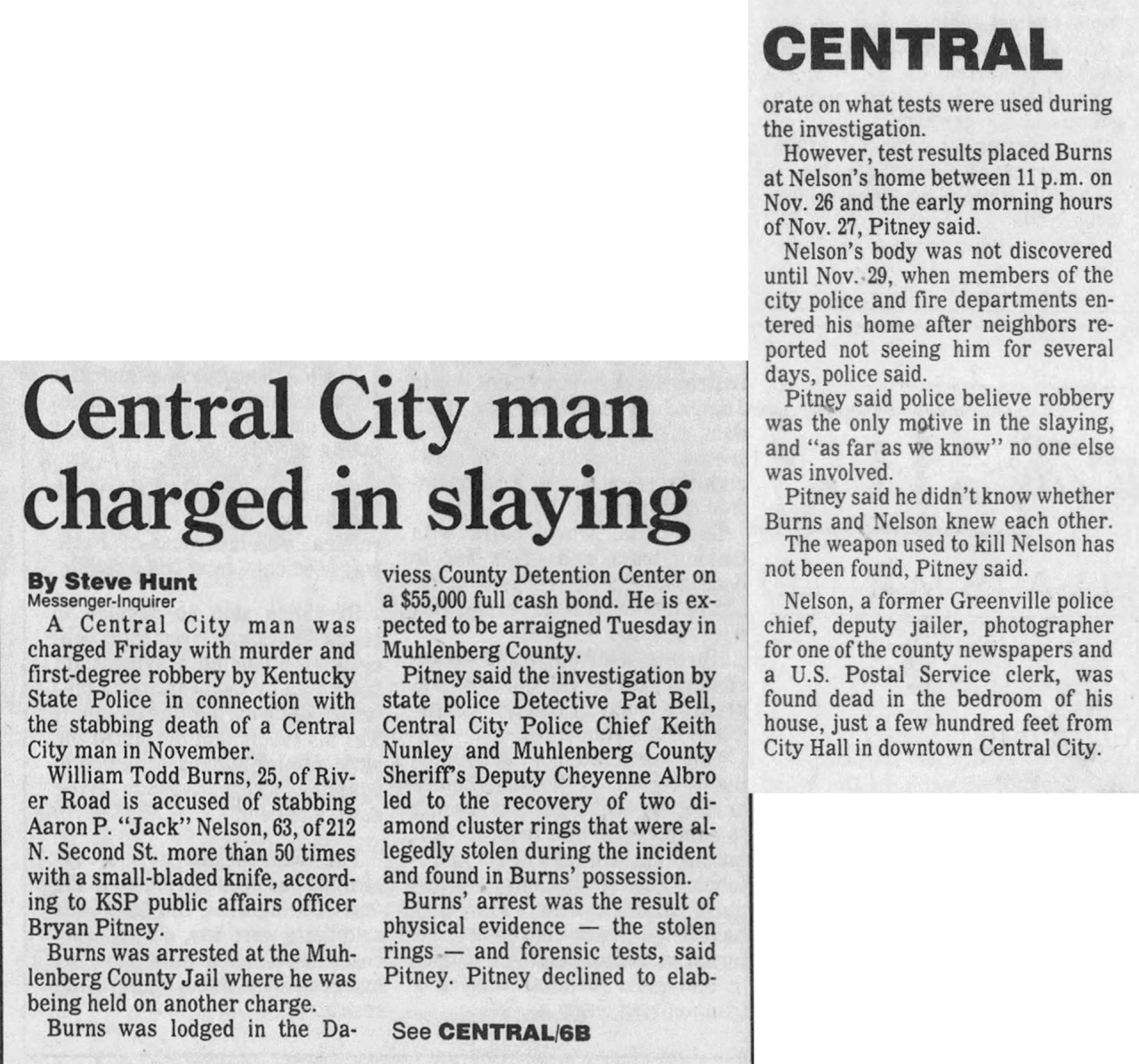 - Central City man charged in slaying. Messenger Inquirer [Owensboro, KY] 30 Dec 1989, Article.