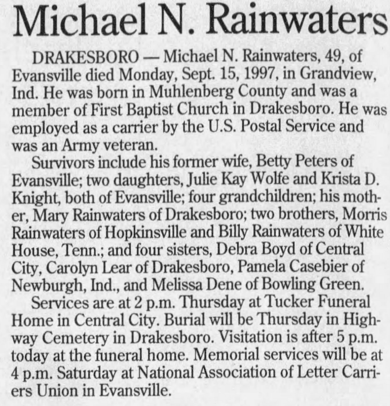 - Messenger Inquirer [Owensboro, KY], 17 Sept 1997, Obituary.