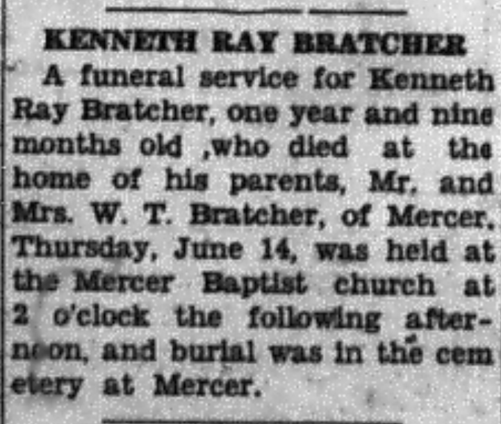 - Bratcher, Kenneth Ray. Greenville Leader [KY], 22 June 1934, Obituary.