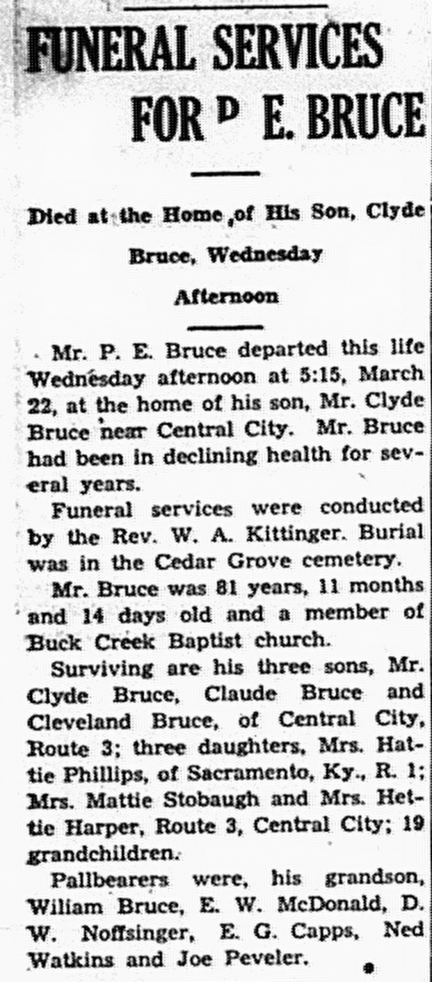 - Bruce, Peter Ephraim. Times Argus [Central City, KY], 31 Mar 1939, Obituary.