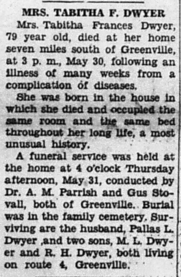 - Dwyer, Tabitha Frances. Greenville Leader [KY], 8 June 1934, Obituary.