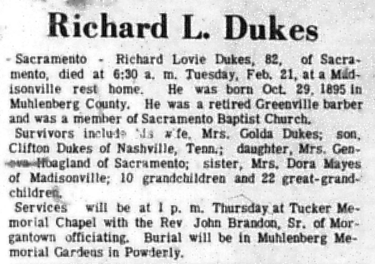 - Dukes, Richard Lovie. Times Argus [Central City, KY], 22 Feb 1978, Obituary.
