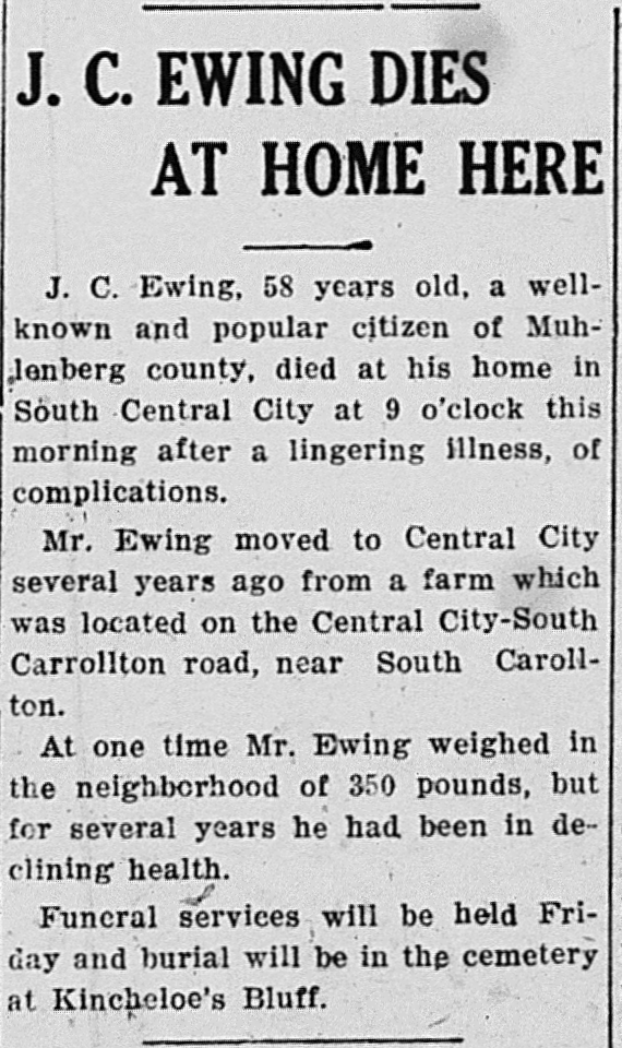 - Ewing, J.C. Messenger [Central City, KY], 21 Sept 1933, Obituary.