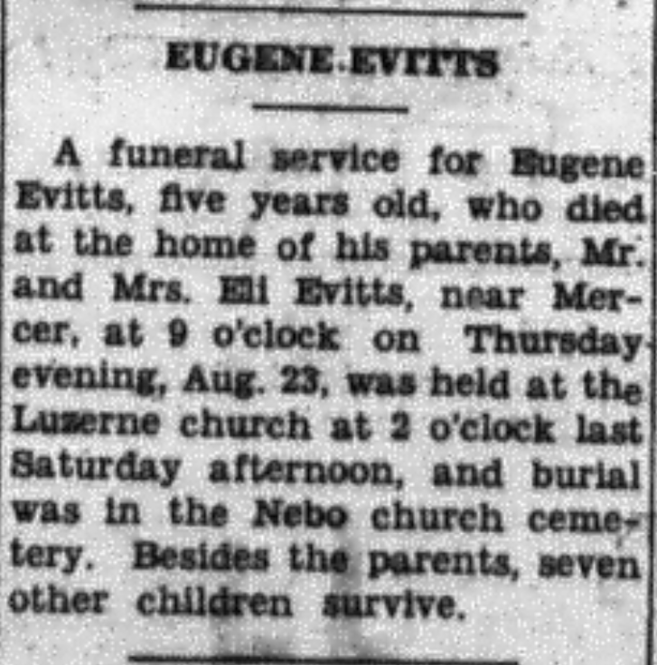Corine Evitts, 6, foster daughter of Mr. and Mrs. Lee Moore, of Central City, died Tuesday, Sept. 24 after being sick for only a few hours. Funeral services were held at 3:00 P.M. Thursday at the Tucker Funeral Home with Rev. Caravans, of Louisville, officiating. Burial was in the Fairmount Cemetery.