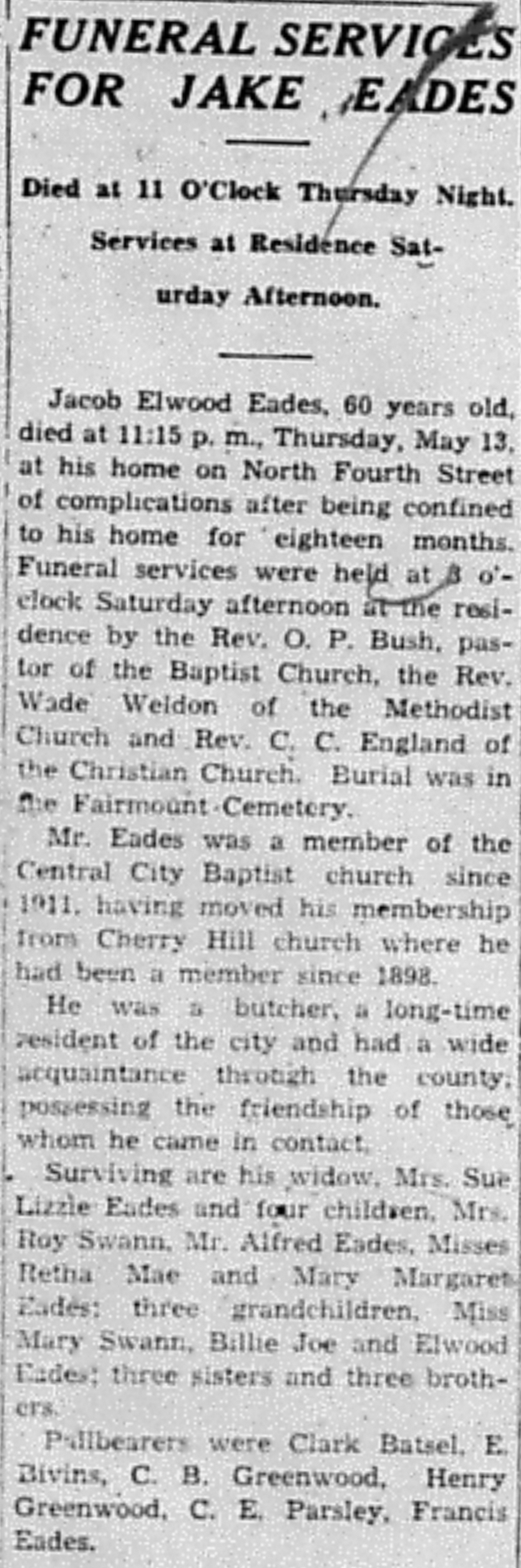 - Eades, Jacob Elwood. Messenger [Central City, KY], 20 May 1937, Obituary.