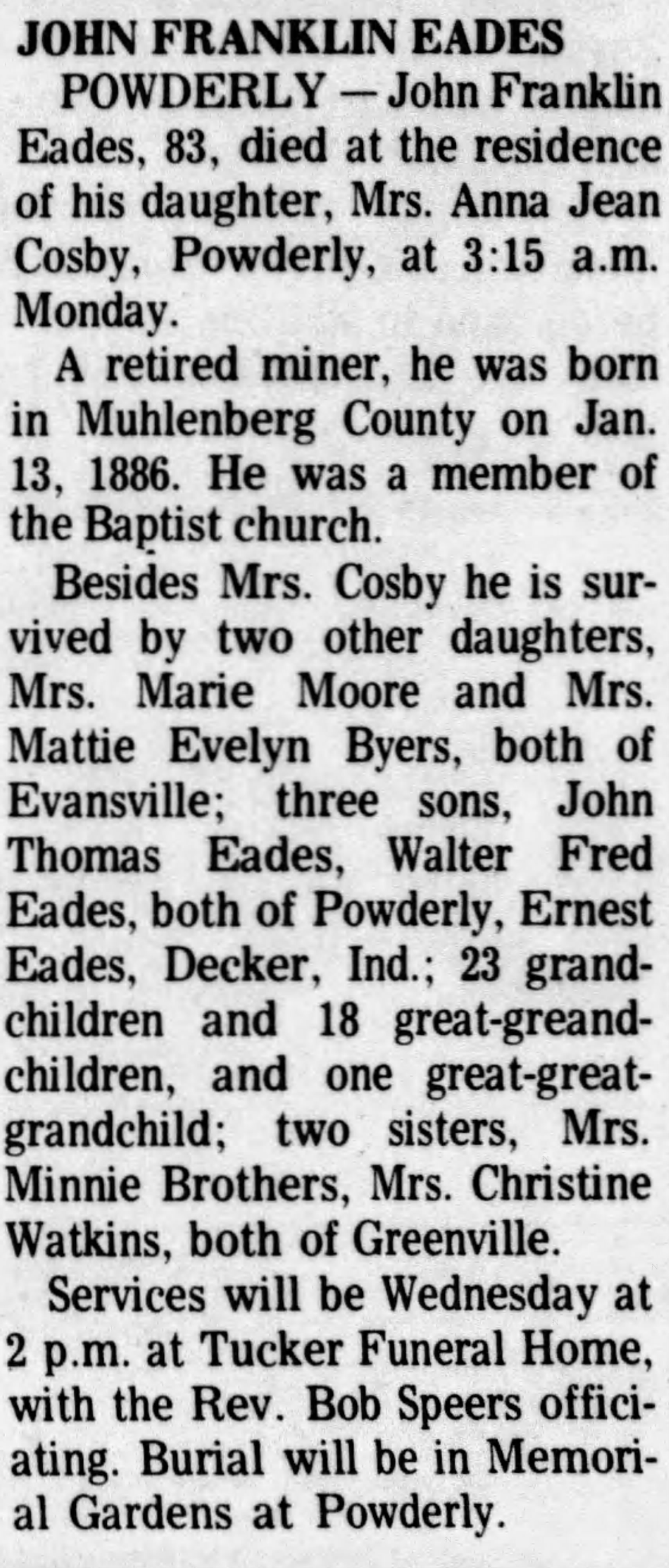 - Eades, John Franklin. Messenger Inquirer [Owensboro, KY], 14 Jan 1969, Obituary.