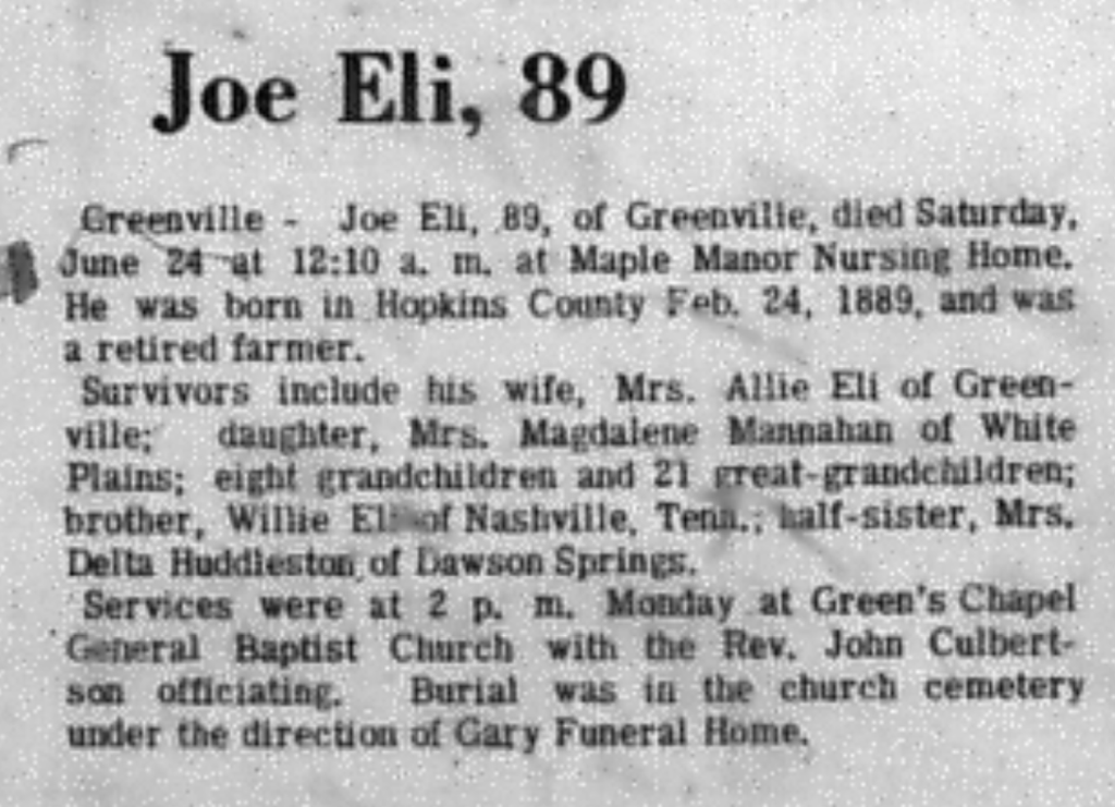- Eli, Joe. Times Argus [Central City, KY], 28 June 1978, Obituary.