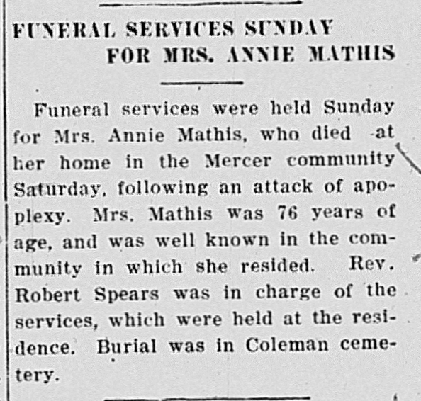 - Mathis, Annie. Messenger [Central City, KY], 5 Oct 1933, Obituary.